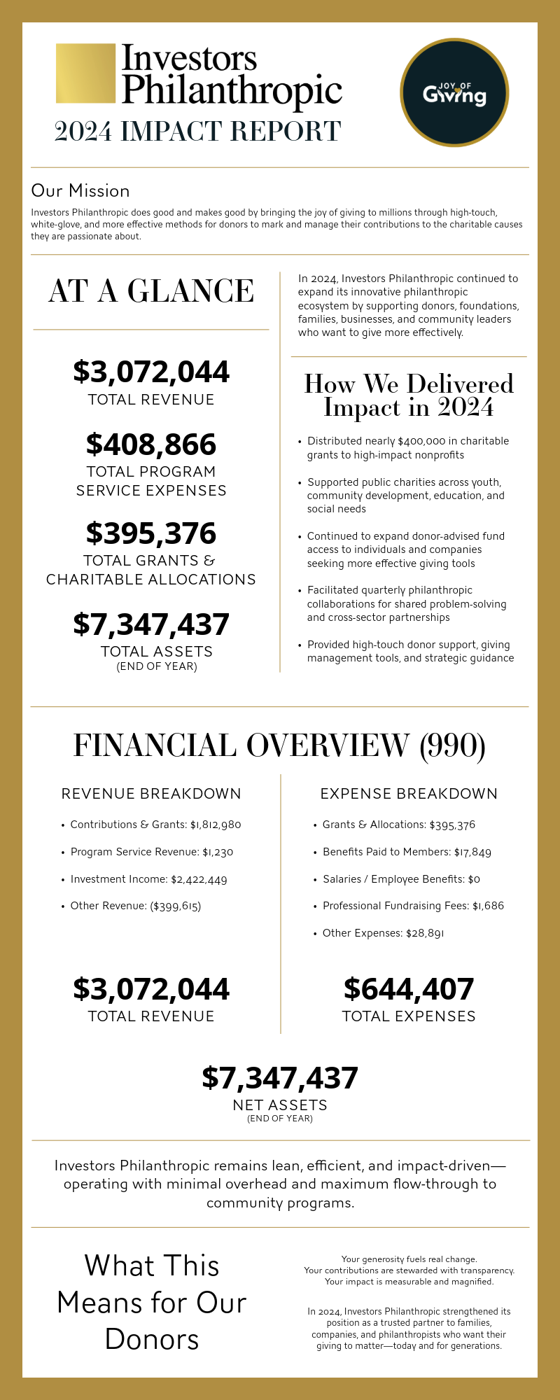 Investors Philanthropic values transparency, accountability and financial stewardship.